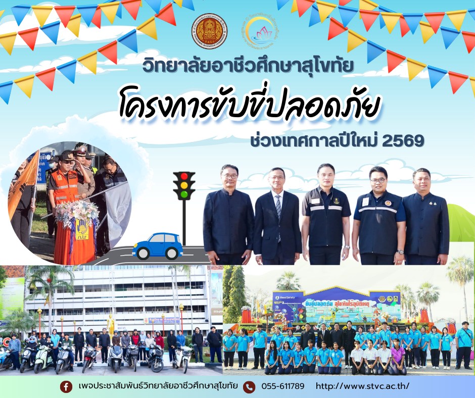วันอังคารที่ 30 ธันวาคม 2568 เวลา 08.30 น. วิทยาลัยอาชีวศึกษาสุโขทัย โดยนายมารุต รื่นรวย ผู้อำนวยการวิทยาลัยอาชีวศึกษาสุโขทัย พร้อมด้วยคณะผู้บริหาร และนักเรียนนักศึกษา ร่วมงานศูนย์ปฏิบัติการป้องกันและลดอุบัติเหตุทางถนนช่วงเทศกาล และช่วงวันหยุด พ.ศ. 2569 จังหวัดสุโขทัย ในช่วงเทศกาลปีใหม่ พ.ศ. 2569