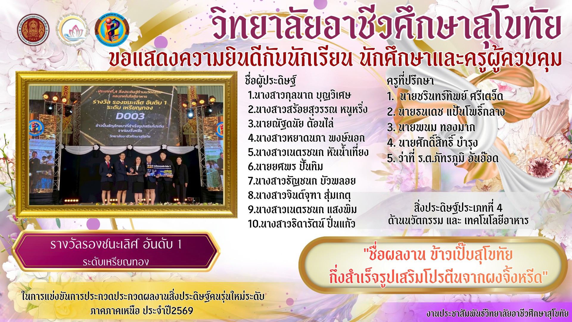 วิทยาลัยอาชีวศึกษาสุโขทัย โดย นายมารุต รื่นรวย ผู้อำนวยการวิทยาลัยอาชีวศึกษาสุโขทัย และนางสาวศตนันท์ อยู่ทอง หัวหน้าวิจัยนวัตกรรมและสิ่งประดิษฐ์นำครูที่ปรึกษาและนักเรียนเข้าร่วมประกวดผลงานสิ่งประดิษฐ์คนรุ่นใหม่ระดับภาค ภาคเหนือ ประจำปี2568 จำนวน 4 ผลงาน