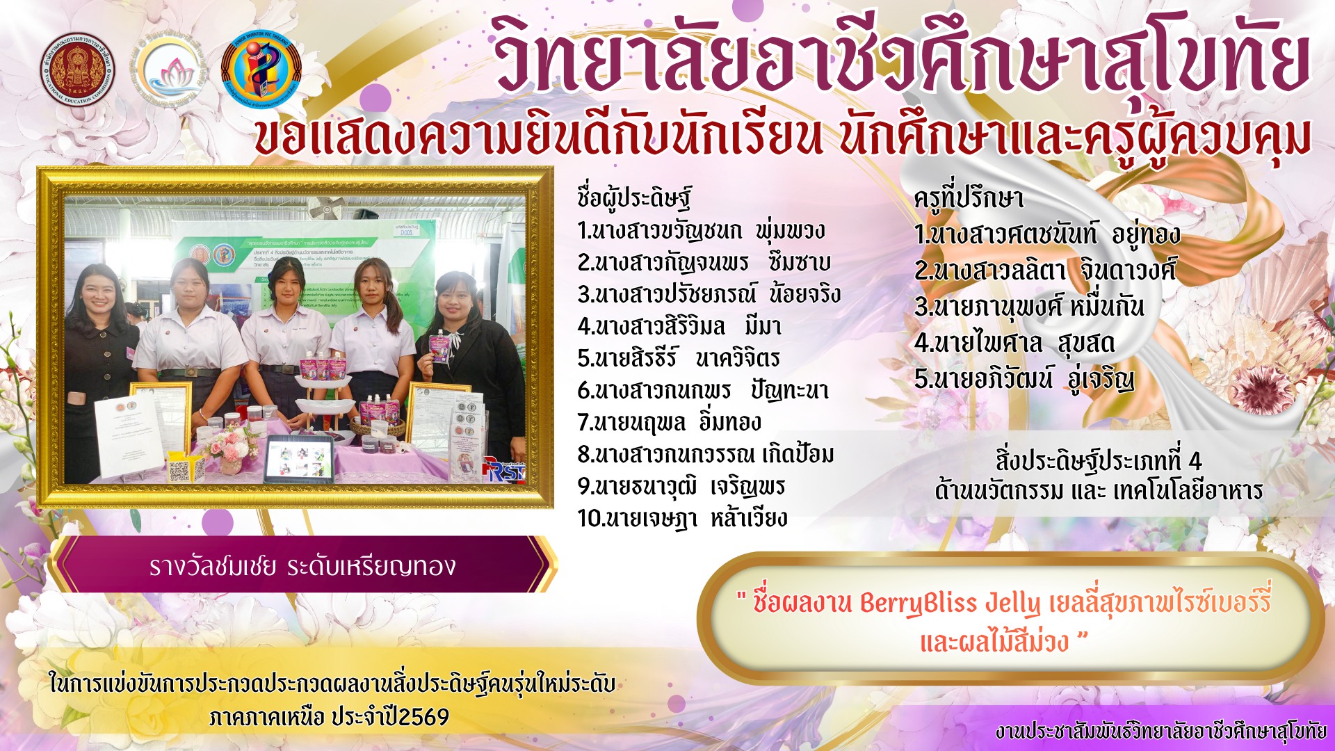 วิทยาลัยอาชีวศึกษาสุโขทัย โดย นายมารุต รื่นรวย ผู้อำนวยการวิทยาลัยอาชีวศึกษาสุโขทัย และ นางสาวศตชนันท์ อยู่ทอง หัวหน้าวิจัยนวัตกรรมและสิ่งประดิษฐ์นำครูที่ปรึกษาและนักเรียนเข้าร่วมประกวดผลงานสิ่งประดิษฐ์คนรุ่นใหม่ระดับภาค ภาคเหนือ ประจำปี 2568 จำนวน 4 ผลงาน จัดขึ้นระหว่างวันที่ 12 – 14 มกราคม 2569 ณ วิทยาลัยเทคนิคลำปาง จ.ลำปาง