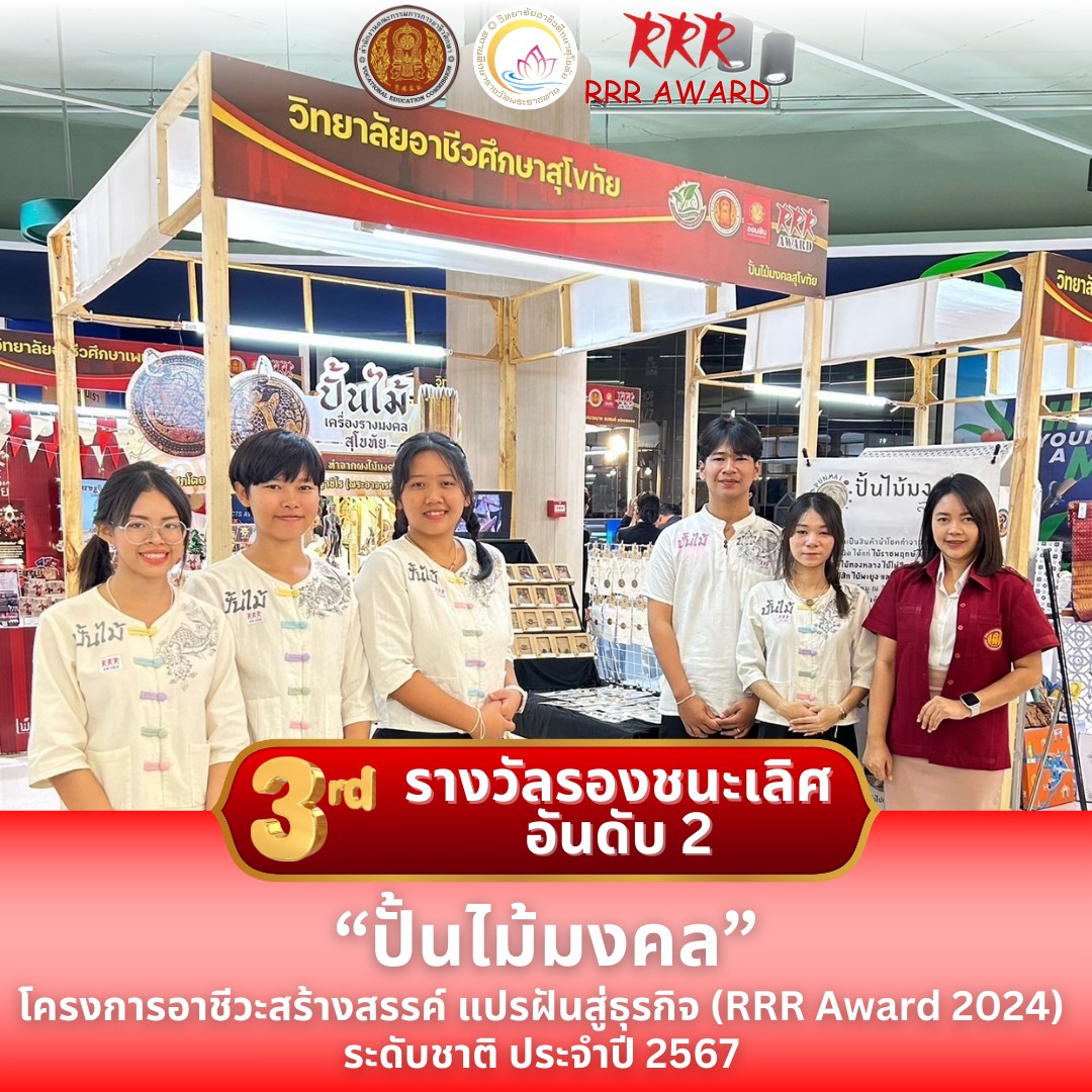 วิทยาลัยอาชีวศึกษาสุโขทัย ขอแสดงความยินดี กับนักเรียน นักศึกษา และครูผู้ควบคุม ได้รับ รางวัลรองชนะเลิศ อันดับ 2 แผนธุรกิจ "ปั้นไม้มงคลสุโขทัย" ในการแข่งขันโครงการอาชีวะสร้างสรรค์ แปรฝันสู่ธุรกิจ (RRR Award 2024) ระดับชาติ ประจำปี 2567 ณ โรบินสันศรีสมาน จ. นนทบุรี ระหว่างวันที่ 17-18 ธันวาคม 2567
