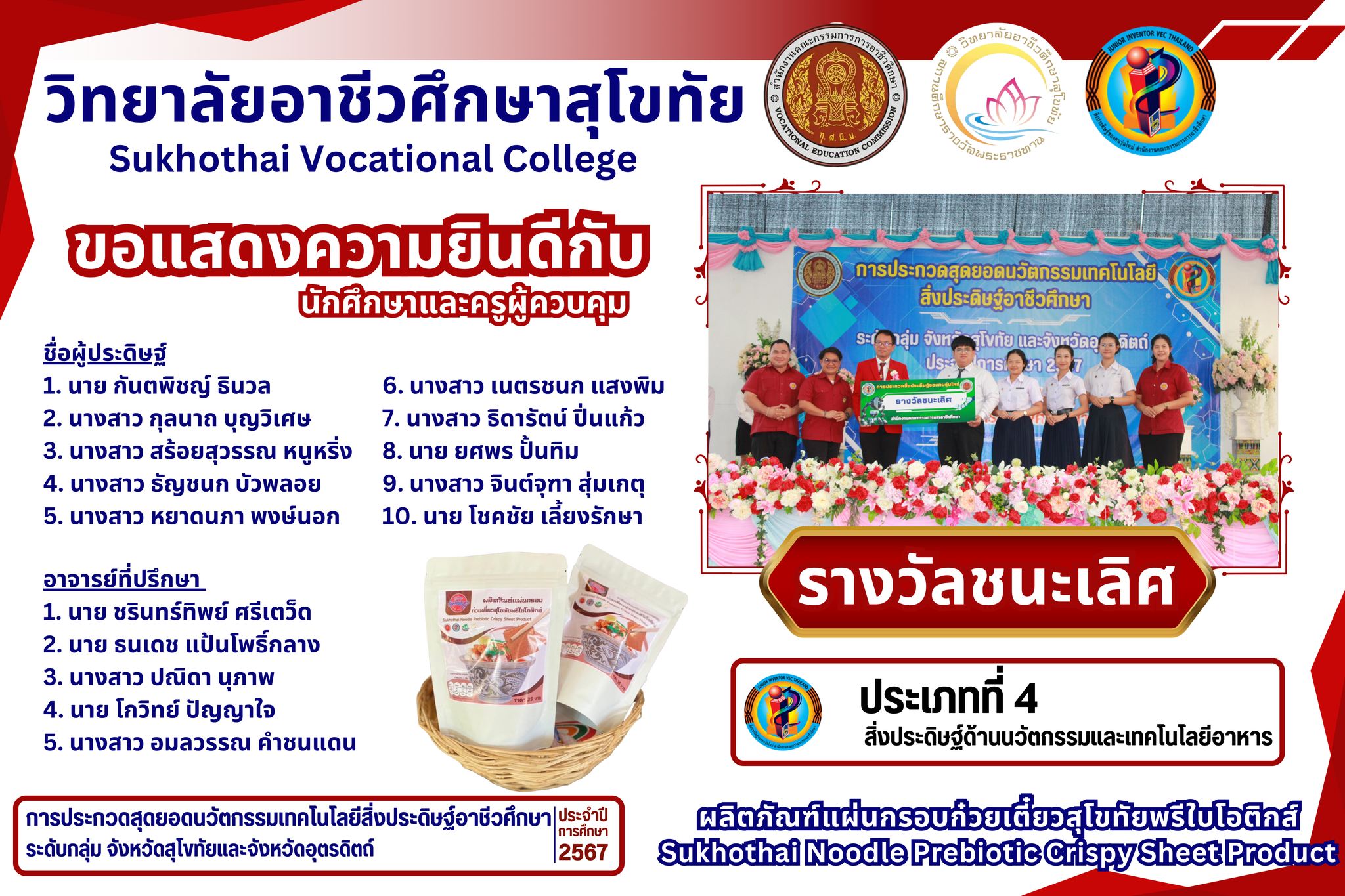 วิทยาลัยอาชีวศึกษาสุโขทัย ขอแสดงความยินดี กับนักเรียน นักศึกษา และครูผู้ควบคุม ได้รับ รางวัลชนะเลิศ ในการแข่งขันการประกวดสุดยอดนวัตกรรมเทคโนโลยีสิ่งประดิษฐ์อาชีวศึกษา ระดับกลุ่ม จังหวัดสุโขทัยและจังหวัดอุตรดิตถ์ ประจำปี 2567