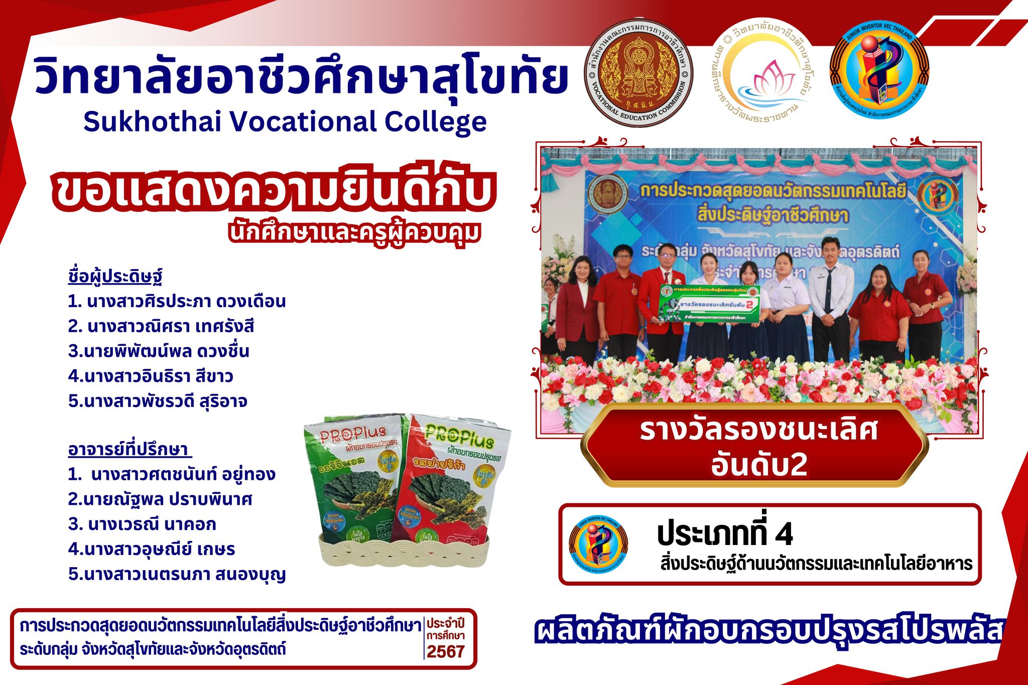 วิทยาลัยอาชีวศึกษาสุโขทัย ขอแสดงความยินดี กับนักเรียน นักศึกษา และครูผู้ควบคุม ได้รับ รางวัลรองชนะเลิศ อันดับ2 ในการแข่งขันการประกวดสุดยอดนวัตกรรมเทคโนโลยีสิ่งประดิษฐ์อาชีวศึกษา ระดับกลุ่ม จังหวัดสุโขทัยและจังหวัดอุตรดิตถ์ ประจำปี 2567