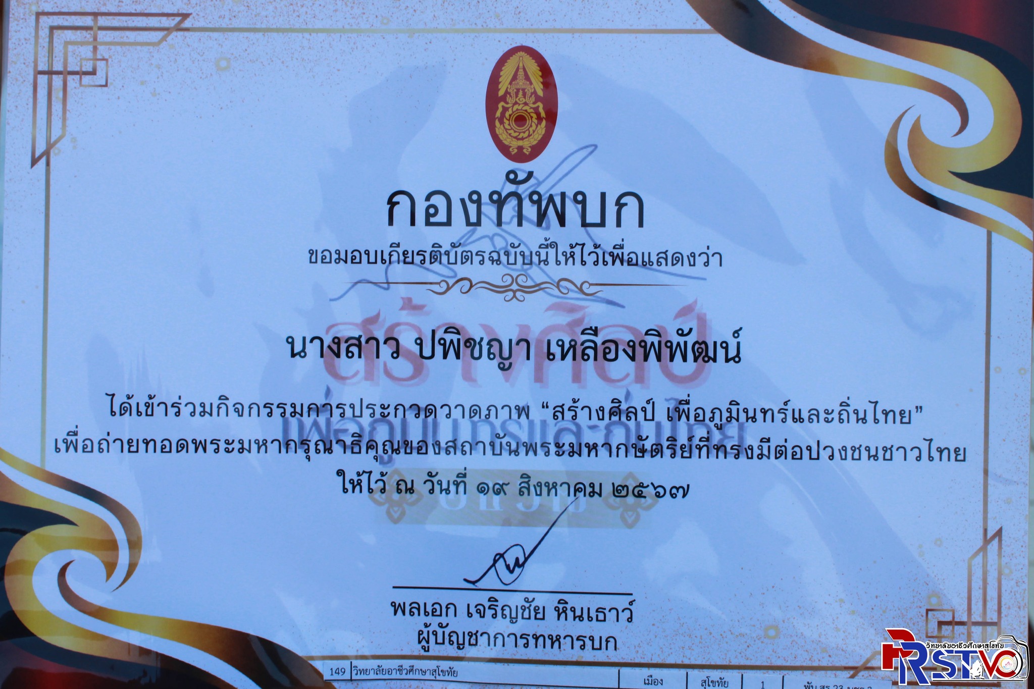 ได้รับผ่านเข้ารอบ ในกิจกรรมการประกวดวาดภาพ ในหัวข้อ “สร้างศิลป์ เพื่อภูมินทร์และถิ่นไทย” จัดโดย กองทัพบก