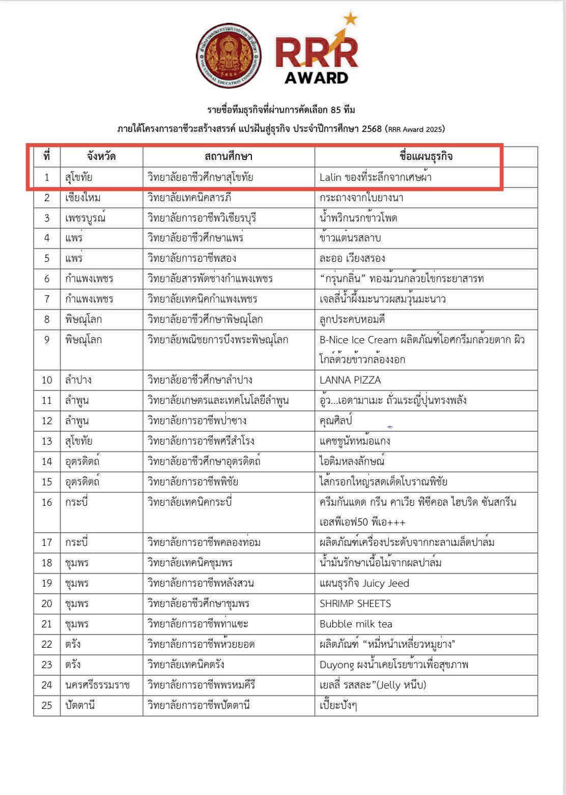 ได้รับคัดเลือกประกาศผล โครงการ "อาชีวะสร้างสรรค์ แปรฝันสู่ธุรกิจ" ประจำปีการศึกษา 2568 หรือ RRR Award 2025 85 ทีมธุรกิจทั้งภาครัฐและเอกชน