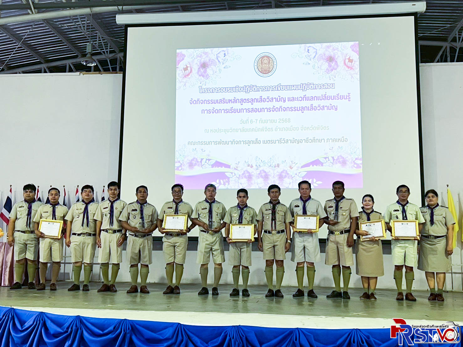 วันที่ 6-7 กันยายน 2568 วิทยาลัยอาชีวศึกษาสุโขทัย โดย นายมารุต รื่นรวย ผู้อำนวยการวิทยาลัยอาชีวศึกษาสุโขทัย มอบหมายให้นายวรพันธ์ เพิ่มพูล รองฝ่ายบริหารทรัพยากร นายชรินทร์ ฟักรักษา รองผู้อำนวยการฝ่ายพัฒนากิจการ และครูชาตรี จันทร์ธีระกุล หัวหน้างานลูกเสือและเนตรนารีวิสามัญ พร้อมด้วยผู้กำกับลูกเสือ วิทยาลัยอาชีวศึกษาสุโขทัย เข้ารับรางวัลการประเมินคัดเลือกผู้บริหาร ครูผู้สอน ผู้สนับสนุน และกิจการลูกเสือดีเด่น ประจำปีการศึกษา 2567 และเข้าร่วมโครงการอบรมเชิงปฏิบัติการการเขียนแผนปฏิบัติการสอน จัดกิจกรรมเสริมหลักสูตรลูกเสือวิสามัญ และเวทีแลกเปลี่ยนเรียนรู้การจัดการเรียนการสอนการจัดกิจกรรมลูกเสือวิสามัญ ณ หอประชุมวิทยาลัยเทคนิคพิจิตร จ.พิจิตร