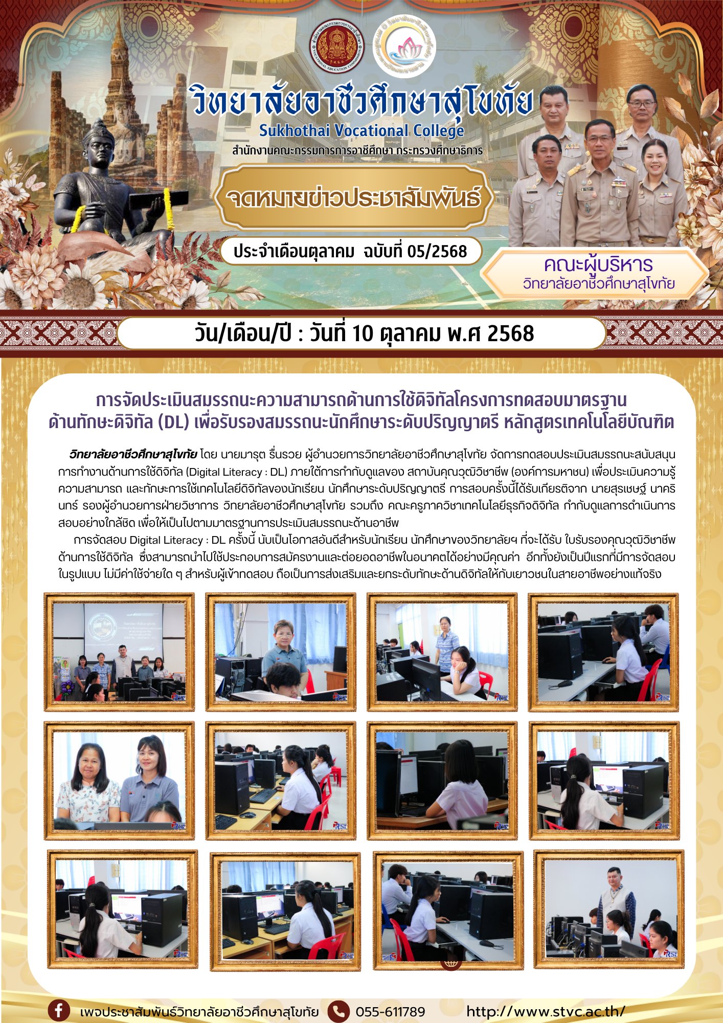 วันที่ 10-11 ตุลาคม 2568 วิทยาลัยอาชีวศึกษาสุโขทัย โดย นายมารุต รื่นรวย ผู้อำนวยการวิทยาลัยอาชีวศึกษาสุโขทัย จัดการทดสอบประเมินสมรรถนะสนับสนุนการทำงานด้านการใช้ดิจิทัล (Digital Literacy : DL) ภายใต้การกำกับดูแลของ สถาบันคุณวุฒิวิชาชีพ (องค์การมหาชน) เพื่อประเมินความรู้ ความสามารถ และทักษะการใช้เทคโนโลยีดิจิทัลของนักเรียน นักศึกษาระดับปริญญาตรี เเละนักศึกษา ทล.บ.เทคโนโลยีไฟฟ้า วิทยาลัยเทคนิคสุโขทัย การสอบครั้งนี้ได้รับเกียรติจาก นายสุรเชษฐ์ นาครินทร์ รองผู้อำนวยการฝ่ายวิชาการ วิทยาลัยอาชีวศึกษาสุโขทัย รวมถึง คณะครูภาควิชาเทคโนโลยีธุรกิจดิจิทัล กำกับดูแลการดำเนินการสอบอย่างใกล้ชิด เพื่อให้เป็นไปตามมาตรฐานการประเมินสมรรถนะด้านอาชีพ