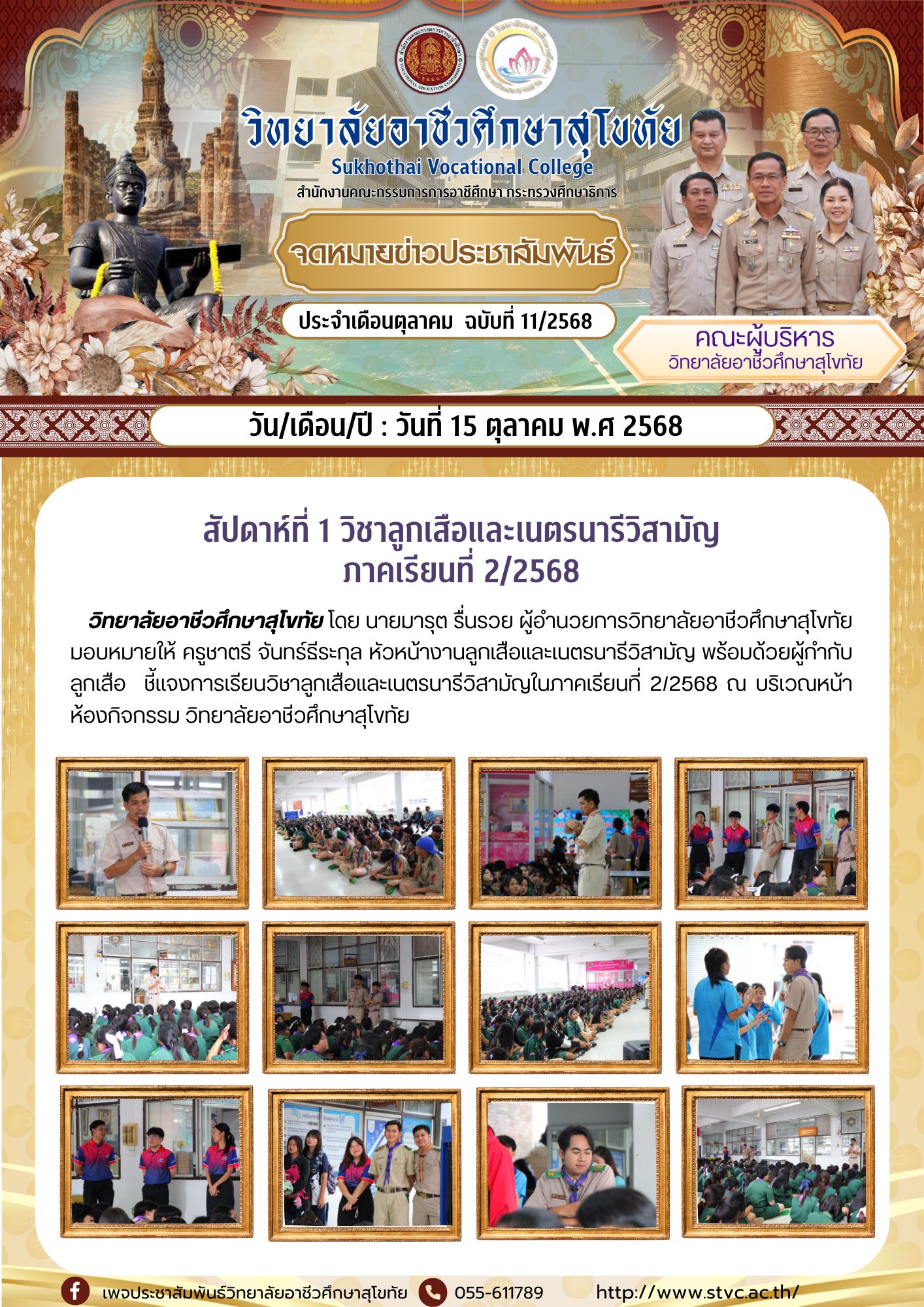 วันพุธที่ 15 ตุลาคม 2568 วิทยาลัยอาชีวศึกษาสุโขทัย โดย นายมารุต รื่นรวย ผู้อำนวยการวิทยาลัยอาชีวศึกษาสุโขทัย มอบหมายให้ ครูชาตรี จันทร์ธีระกุล หัวหน้างานลูกเสือและเนตรนารีวิสามัญ พร้อมด้วยผู้กำกับลูกเสือ ชี้เเจงการเรียนวิชาลูกเสือและเนตรนารีวิสามัญในภาคเรียนที่ 2/2568 ณ บริเวณหน้าห้องกิจกรรม วิทยาลัยอาชีวศึกษาสุโขทัย