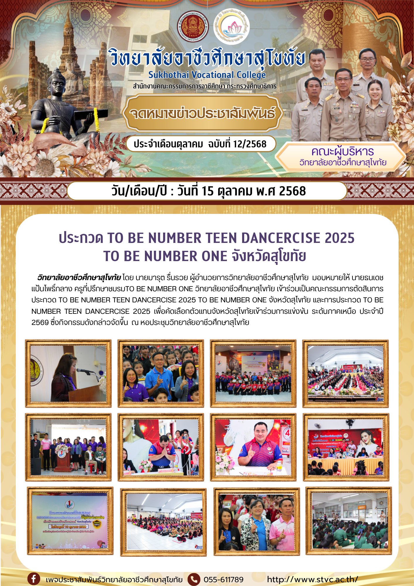 วันที่ 15 ตุลาคม 2568 วิทยาลัยอาชีวศึกษาสุโขทัย โดย นายมารุต รื่นรวย ผู้อำนวยการวิทยาลัยอาชีวศึกษาสุโขทัย มอบหมายให้ นายธนเดช แป้นโพธิ์กลาง ครูที่ปรึกษาชมรมTO BE NUMBER ONE วิทยาลัยอาชีวศึกษาสุโขทัย เข้าร่วมเป็นคณะกรรมการตัดสินการประกวด TO BE NUMBER TEEN DANCERCISE 2025 TO BE NUMBER ONE จังหวัดสุโขทัย เเละการประกวด TO BE NUMBER TEEN DANCERCISE 2025 เพื่อคัดเลือกตัวแทนจังหวัดสุโขทัยเข้าร่วมการแข่งขัน ระดับภาคเหนือ ประจำปี 2569 ณ หอประชุมวิทยาลัยอาชีวศึกษาสุโขทัย