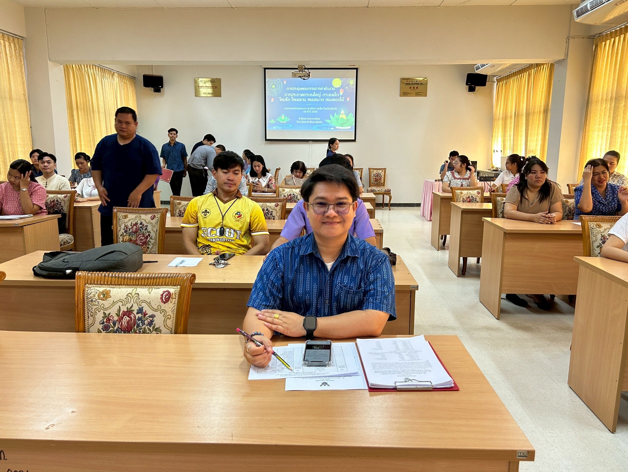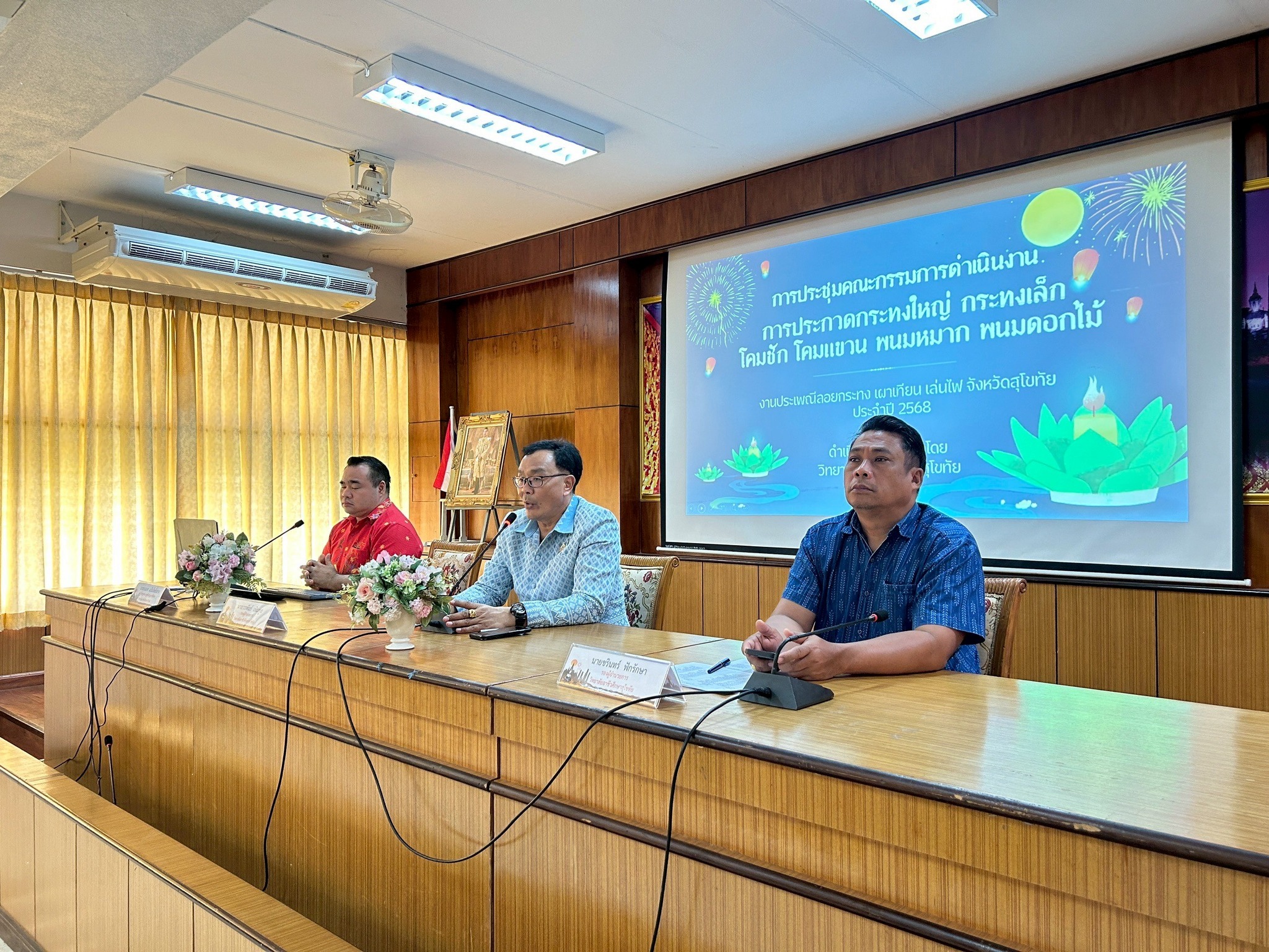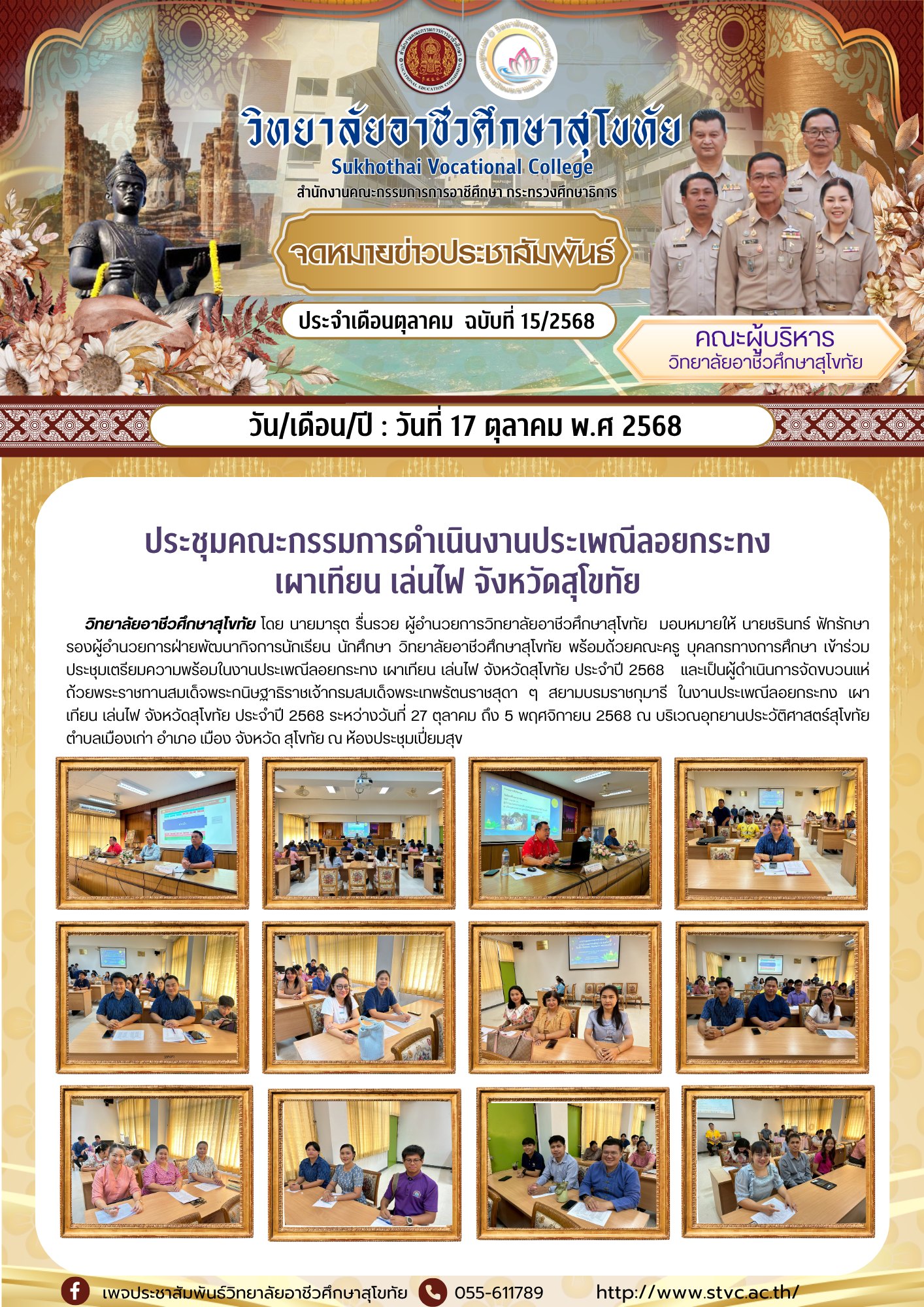วันที่ 17 ตุลาคม 2568 วิทยาลัยอาชีวศึกษาสุโขทัย โดย นายมารุต รื่นรวย ผู้อำนวยการวิทยาลัยอาชีวศึกษาสุโขทัย มอบหมายให้ นายชรินทร์ ฟักรักษา รองผู้อำนวยการฝ่ายพัฒนากิจการนักเรียน นักศึกษา วิทยาลัยอาชีวศึกษาสุโขทัย พร้อมด้วยคณะครู บุคลกรทางการศึกษา เข้าร่วมประชุมเตรียมความพร้อมในงานประเพณีลอยกระทง เผาเทียน เล่นไฟ จังหวัดสุโขทัย ประจำปี 2568 และเป็นผู้ดำเนินการจัดขบวนแห่ถ้วยพระราชทานสมเด็จพระกนิษฐาธิราชเจ้ากรมสมเด็จพระเทพรัตนราชสุดา ๆ สยามบรมราชกุมารี ในงานประเพณีลอยกระทง เผาเทียน เล่นไฟ จังหวัดสุโขทัย ประจำปี 2568 ระหว่างวันที่ 27 ตุลาคม ถึง 5 พฤศจิกายน 2568 ณ บริเวณอุทยานประวัติศาสตร์สุโขทัย ตำบลเมืองเก่า อำเภอ เมือง จังหวัด สุโขทัย ณ ห้องประชุมเปี่ยมสุข