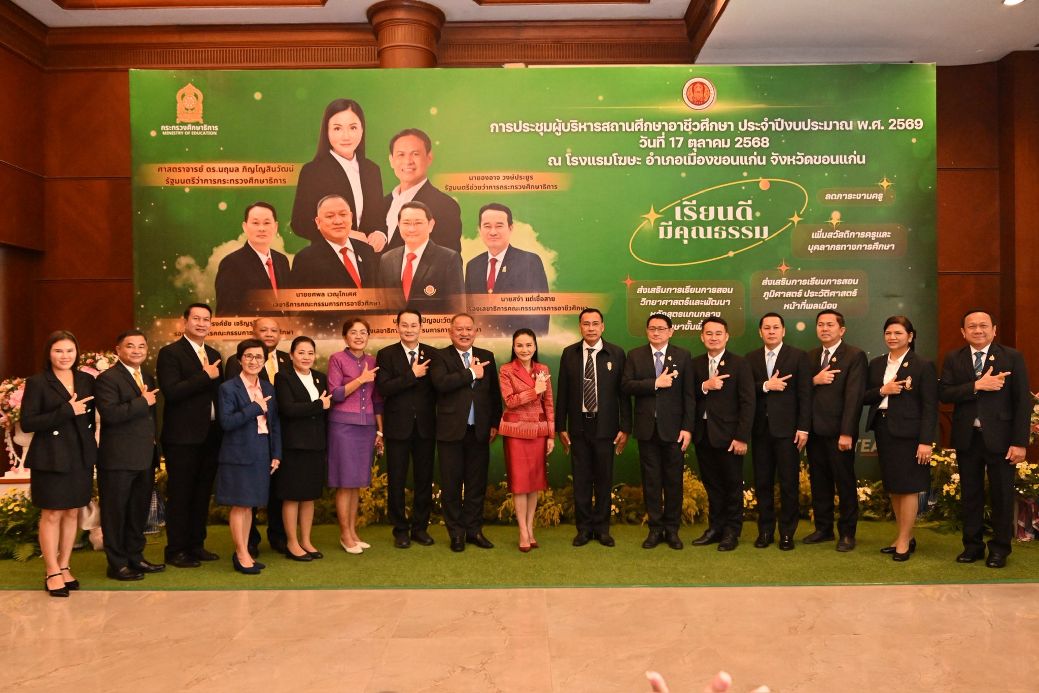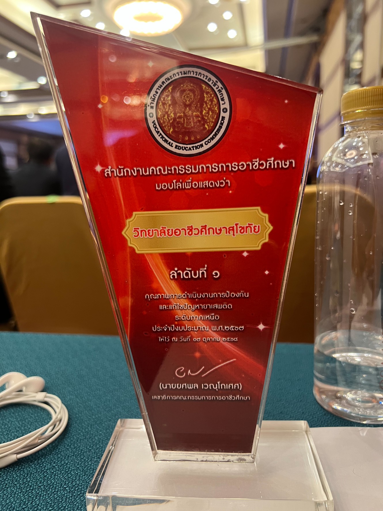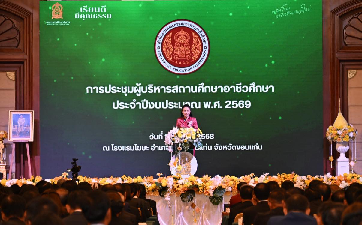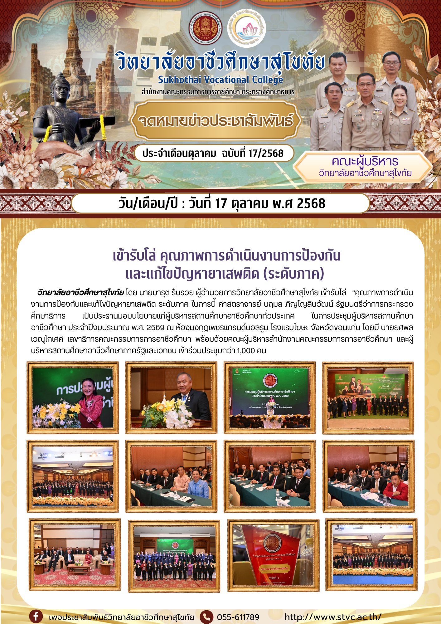 วันที่ 17 ตุลาคม 2568 วิทยาลัยอาชีวศึกษาสุโขทัย โดย นายมารุต รื่นรวย ผู้อำนวยการวิทยาลัยอาชีวศึกษาสุโขทัย เข้ารับโล่ “คุณภาพการดำเนินงานการป้องกันและแก้ไขปัญหายาเสพติด ระดับภาค ในการนี้ ศาสตราจารย์ นฤมล ภิญโญสินวัฒน์ รัฐมนตรีว่าการกระทรวงศึกษาธิการ เป็นประธานมอบนโยบายแก่ผู้บริหารสถานศึกษาอาชีวศึกษาทั่วประเทศ ในการประชุมผู้บริหารสถานศึกษาอาชีวศึกษา ประจำปีงบประมาณ พ.ศ. 2569 ณ ห้องมงกุฎเพชรแกรนด์บอลรูม โรงแรมโฆษะ จังหวัดขอนแก่น โดยมี นายยศพล เวณุโกเศศ เลขาธิการคณะกรรมการการอาชีวศึกษา พร้อมด้วยคณะผู้บริหารสำนักงานคณะกรรมการการอาชีวศึกษา และผู้บริหารสถานศึกษาอาชีวศึกษาภาครัฐและเอกชน เข้าร่วมประชุมกว่า 1,000 คน