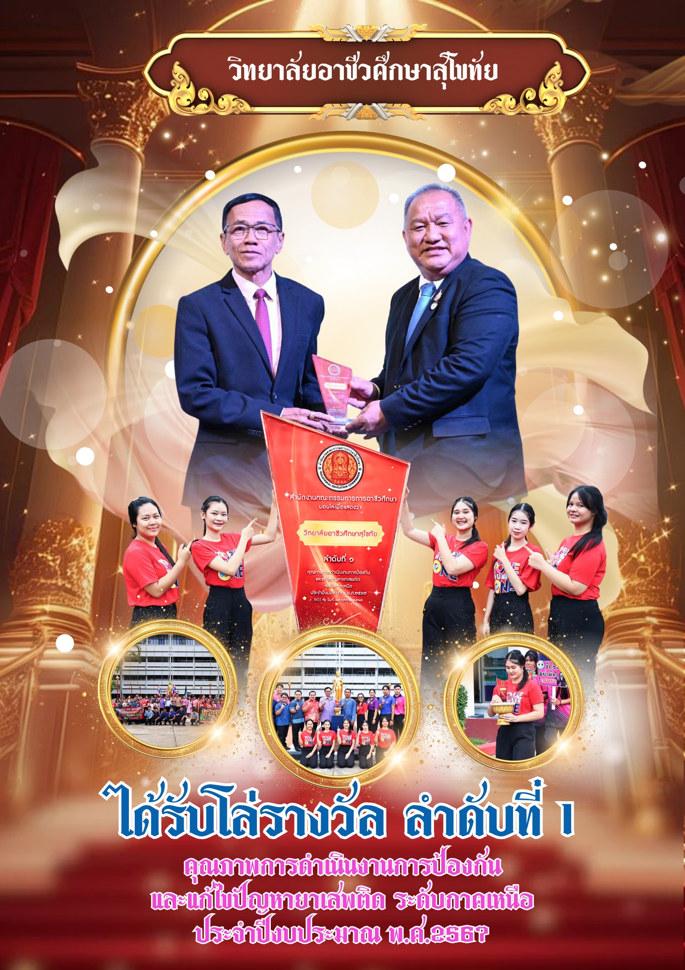 วันที่ 24 ตุลาคม 2568 วิทยาลัยอาชีวศึกษาสุโขทัย โดย นายมารุต รื่นรวย ผู้อำนวยการวิทยาลัยอาชีวศึกษาสุโขทัย พร้อมด้วยคณะผู้บริหาร คณะครู บุคลากรทางการศึกษา และนักเรียน นักศึกษา ร่วมแสดความยินดีกับ นักศึกษาและคุณครูผู้ควบคุม ทั้งนี้คณะผู้บริหารมอบโล่รับรางวัล “อันดับ1” คุณภาพการดำเนินงานการป้องกัน และแก้ไขปัญหายาเสพติด ระดับกาคเหนือ ประจำปีงบประมาณ พ.ศ.2567