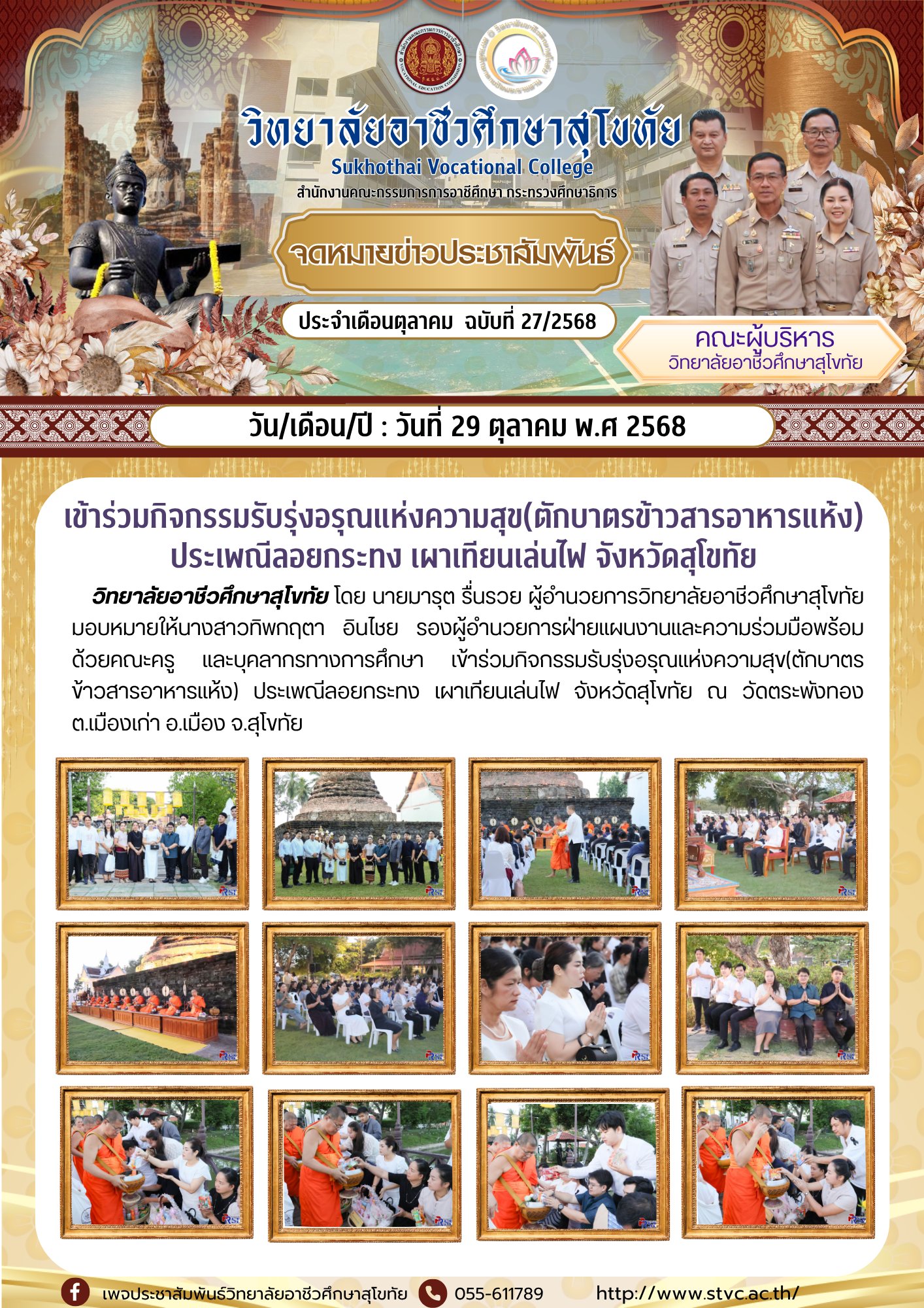29 พฤศจิกายน 2568 วิทยาลัยอาชีวศึกษาสุโขทัย โดย นายมารุต รื่นรวย ผู้อำนวยการวิทยาลัยอาชีวศึกษาสุโขทัย มอบหมายให้นางสาวทิพกฤตา อินไชย รองผู้อำนวยการฝ่ายแผนงานและความร่วมมือพร้อมด้วยคณะครู และบุคลากรทางการศึกษา เข้าร่วมกิจกรรมรับรุ่งอรุณแห่งความสุข(ตักบาตรข้าวสารอาหารแห้ง) ประเพณีลอยกระทง เผาเทียนเล่นไฟ จังหวัดสุโขทัย ณ วัดตระพังทอง ต.เมืองเก่า อ.เมือง จ.สุโขทัย