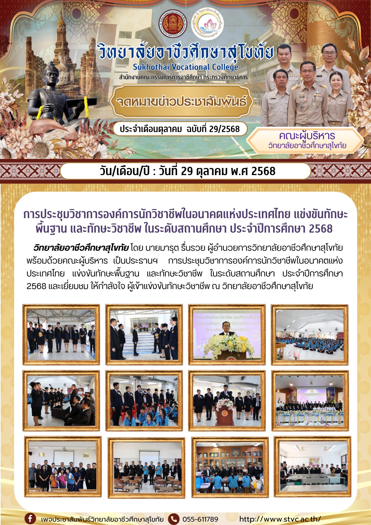 29 ตุลาคม 2568 วิทยาลัยอาชีวศึกษาสุโขทัย โดย นายมารุต รื่นรวย ผู้อำนวยการวิทยาลัยอาชีวศึกษาสุโขทัย เป็นประธานในพิธีเปิดงาน ประชุมวิชาการองค์การนักวิชาชีพในอนาคตแห่งประเทศไทย (อวท.) ระดับสถานศึกษา ประจำปีการศึกษา 2568