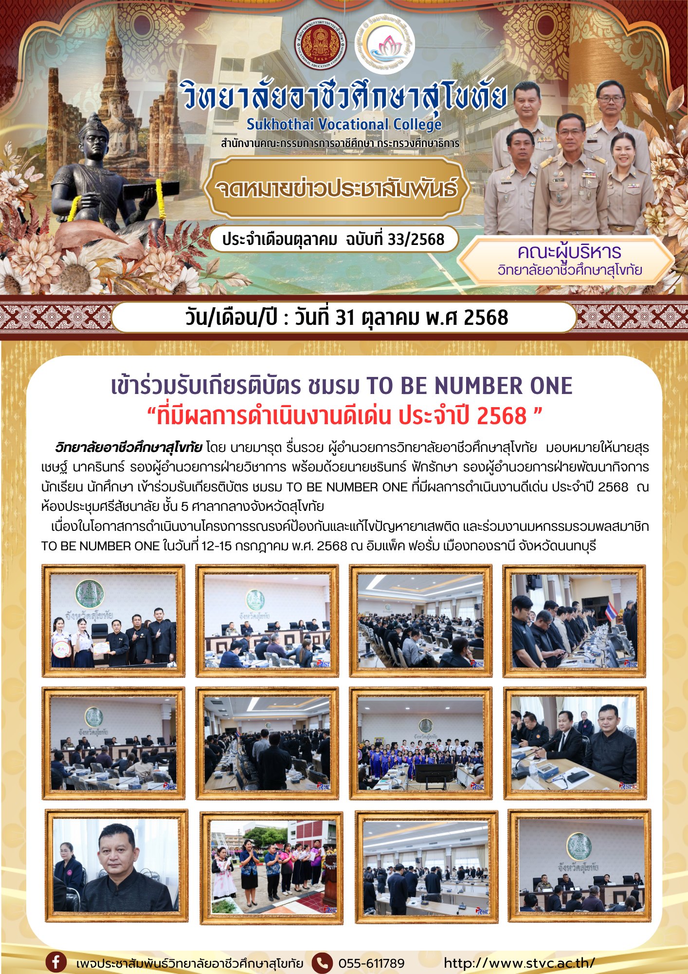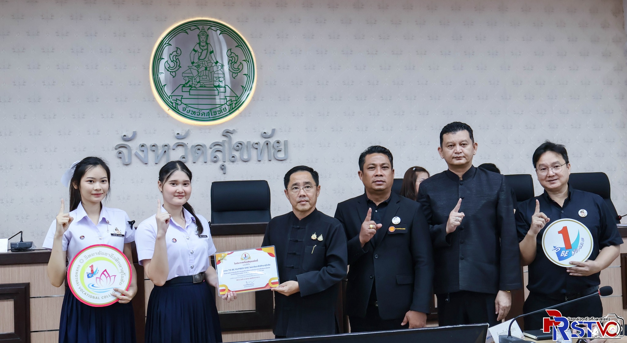 วันที่ 31 ตุลาคม 2568 วิทยาลัยอาชีวศึกษาสุโขทัย โดย นายมารุต รื่นรวย ผู้อำนวยการวิทยาลัยอาชีวศึกษาสุโขทัย มอบหมายให้นายสุรเชษฐ์ นาครินทร์ รองผู้อำนวยการฝ่ายวิชาการ พร้อมด้วยนายชรินทร์ ฟักรักษา รองผู้อำนวยการฝ่ายพัฒนากิจการนักเรียน นักศึกษา เข้าร่วมรับเกียรติบัตร ชมรม TO BE NUMBER ONE ที่มีผลการดำเนินงานดีเด่น ประจำปี 2568 ณ ห้องประชุมศรีสัชนาลัย ชั้น 5 ศาลากลางจังหวัดสุโขทัย