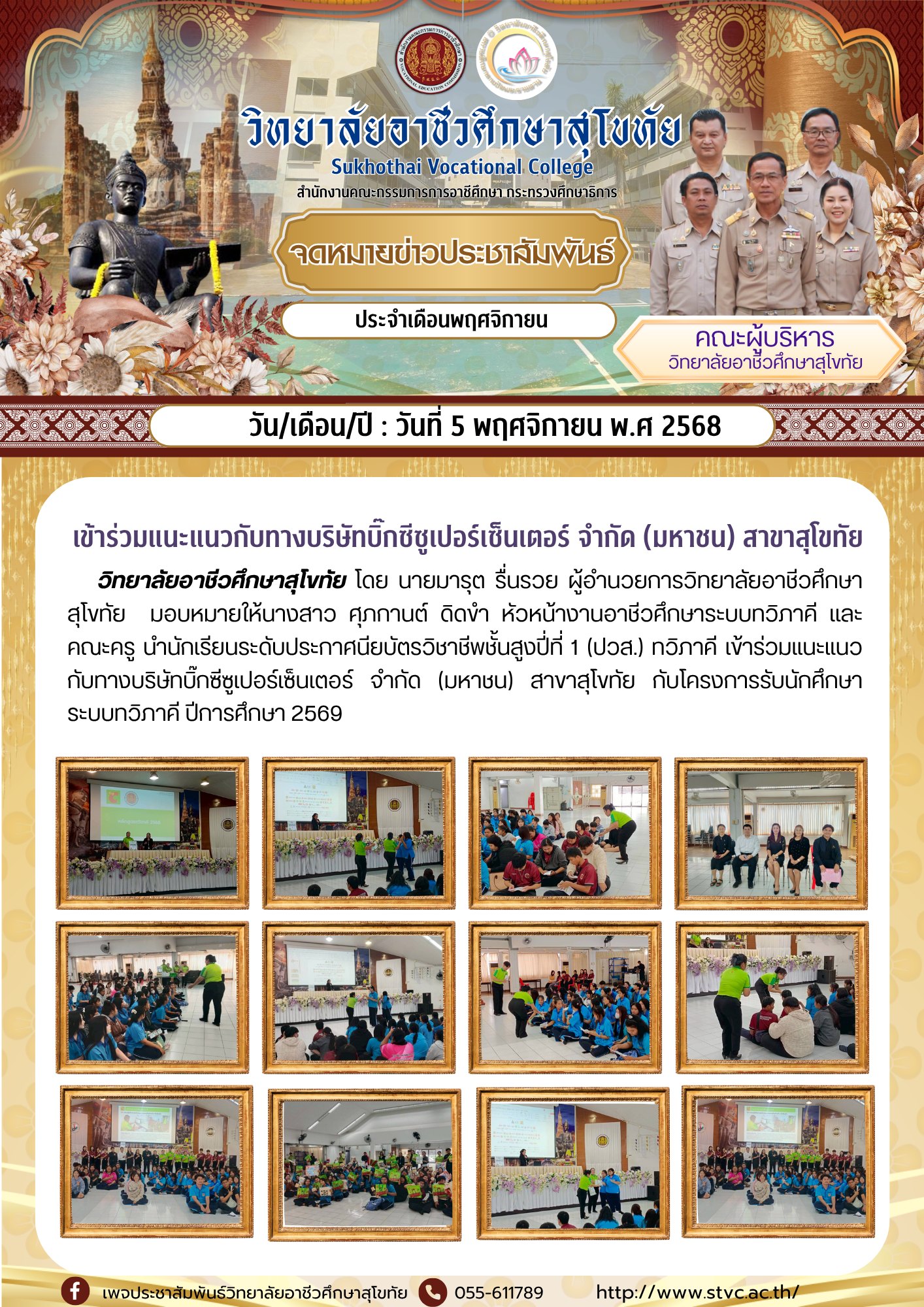 วันที่ 5 พฤศจิกายน 2568 วิทยาลัยอาชีวศึกษาสุโขทัย โดย นายมารุต รื่นรวย ผู้อำนวยการวิทยาลัยอาชีวศึกษาสุโขทัย มอบหมายให้นางสาว ศุภกานต์ ดิดขำ หัวหน้างานอาชีวศึกษาระบบทวิภาคี เเละคณะครู นำนักเรียนระดับประกาศนียบัตรวิชาชีพชั้นสูงปี่ที่ 1 (ปวส.) ทวิภาคี เข้าร่วมแนะแนวกับทางบริษัทบิ๊กซีซูเปอร์เซ็นเตอร์ จำกัด (มหาชน) สาขาสุโขทัย กับโครงการรับนักศึกษาระบบทวิภาคี ปีการศึกษา 2569 ณ หอประชุมวิทยาลัยอาชีวศึกษาสุโขทัย
