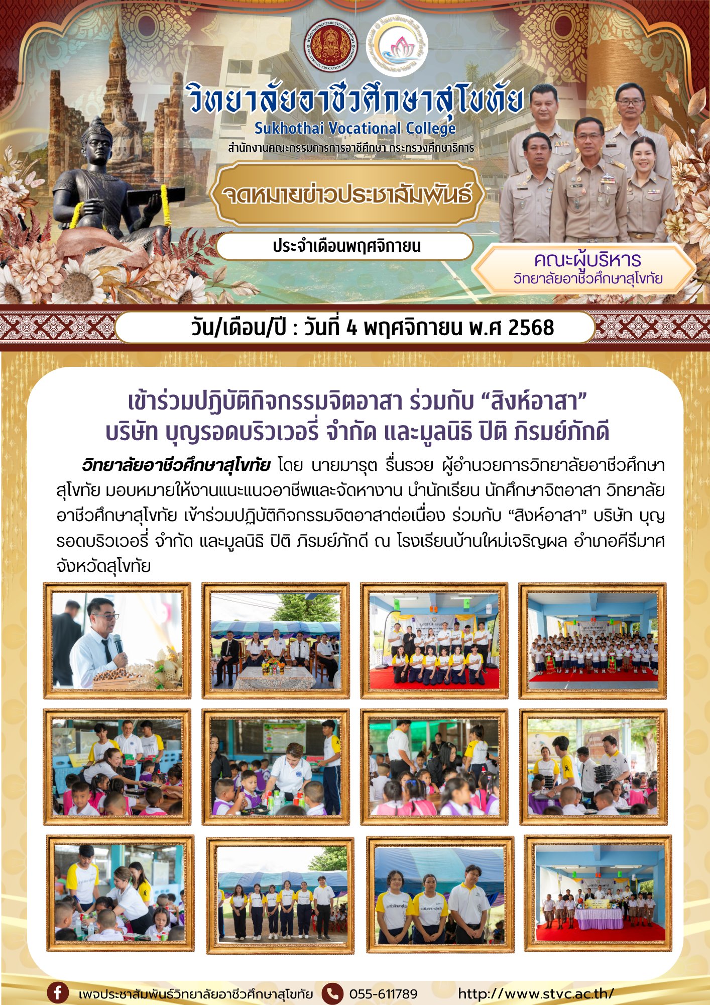 วันที่ 4 พฤศจิกายน 2568 นายมารุต รื่นรวย ผู้อำนวยการวิทยาลัยอาชีวศึกษาสุโขทัย มอบหมายให้งานแนะแนวอาชีพและจัดหางาน นำนักเรียน นักศึกษาจิตอาสา วิทยาลัยอาชีวศึกษาสุโขทัย เข้าร่วมปฏิบัติกิจกรรมจิตอาสาต่อเนื่อง ร่วมกับ “สิงห์อาสา” บริษัท บุญรอดบริวเวอรี่ จำกัด และมูลนิธิ ปิติ ภิรมย์ภักดี ณ โรงเรียนบ้านใหม่เจริญผล อำเภอคีรีมาศ จังหวัดสุโขทัย